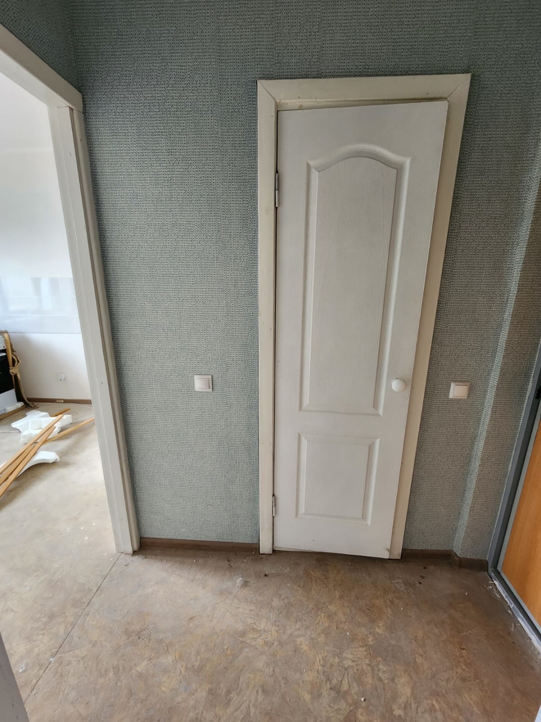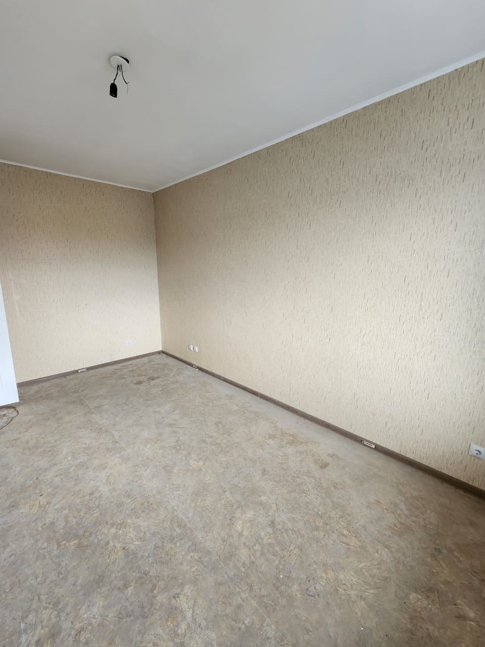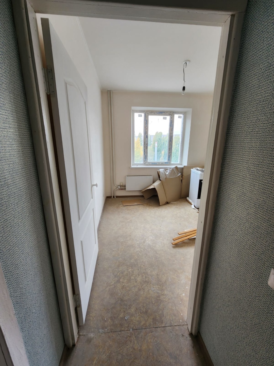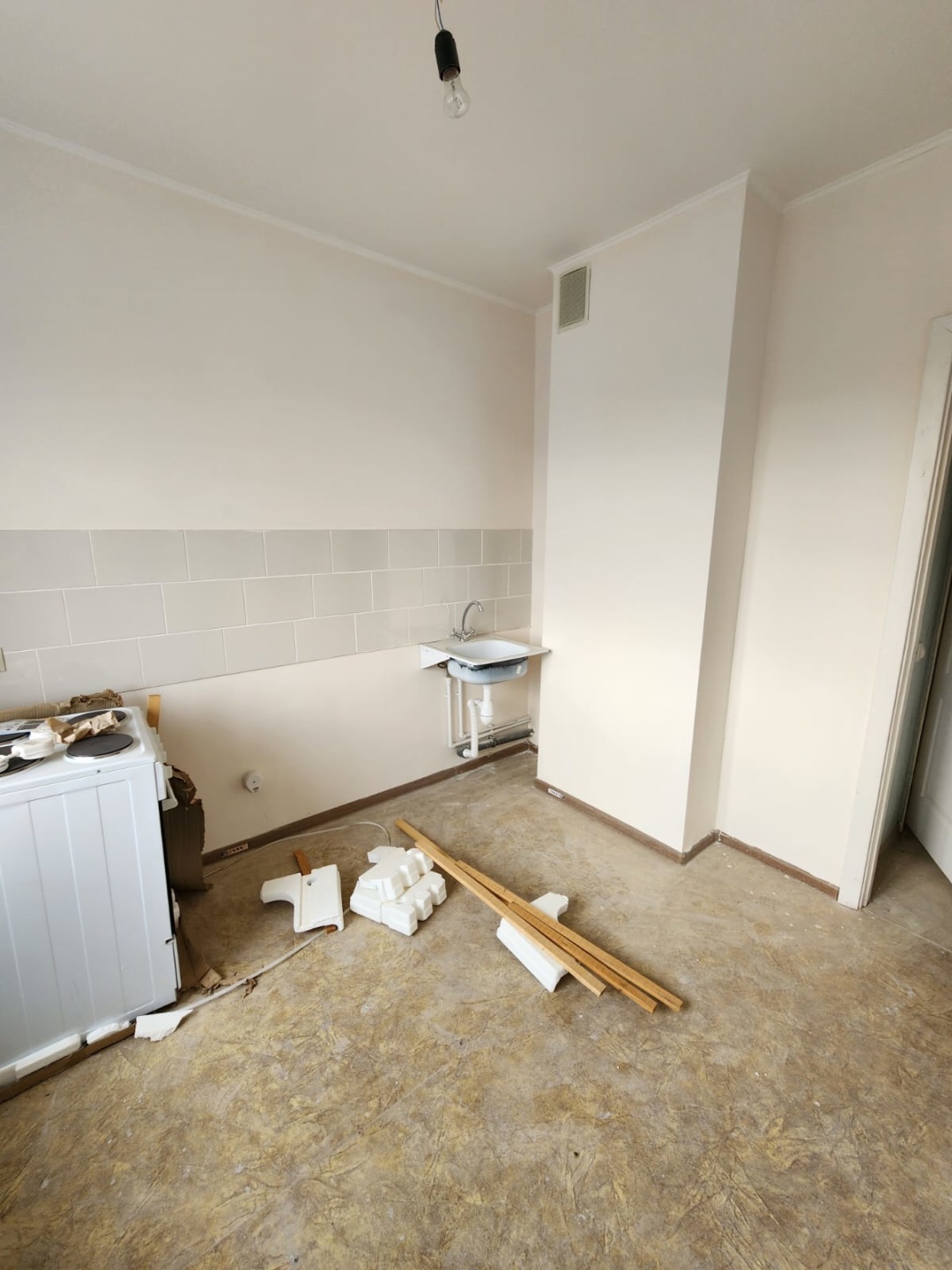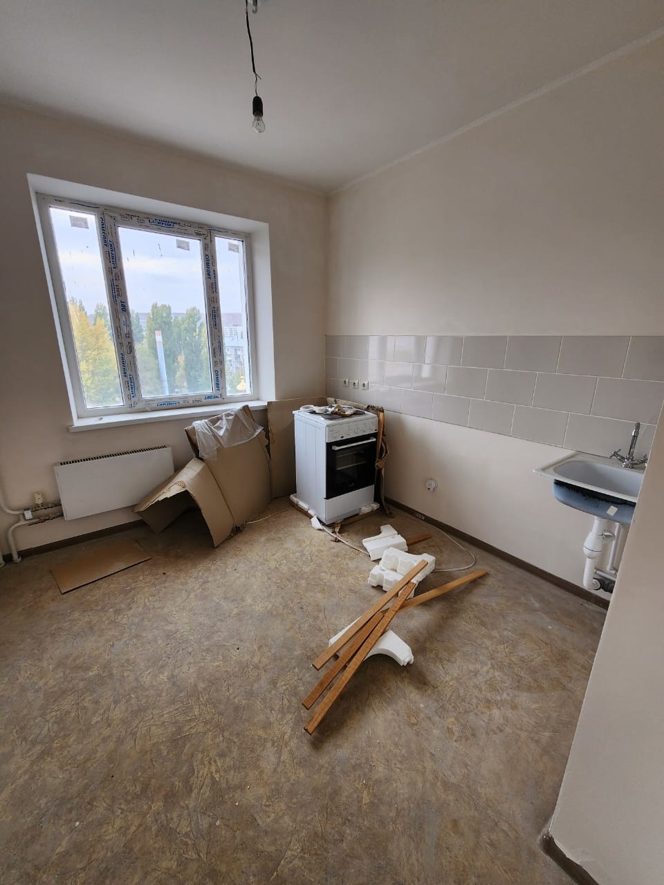 В квартире косметический ремонт от застройщика. Никто не жил. Пластиковые окна, новая сантехника, ровные полы и стены, линолеум, обои. Кухонный фартук выложен кафелем, в ванной комнате выложена плиткой стена над ванной.