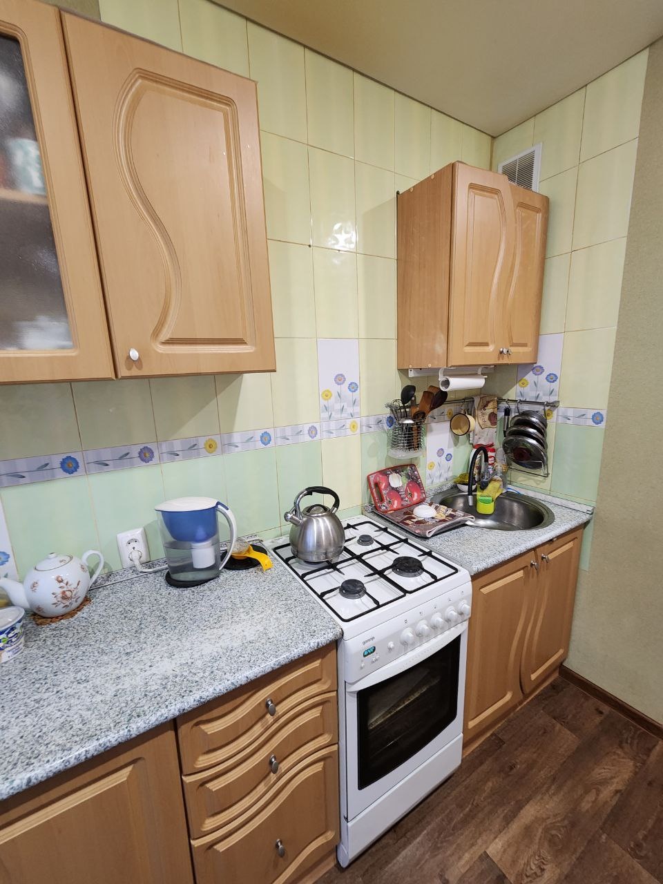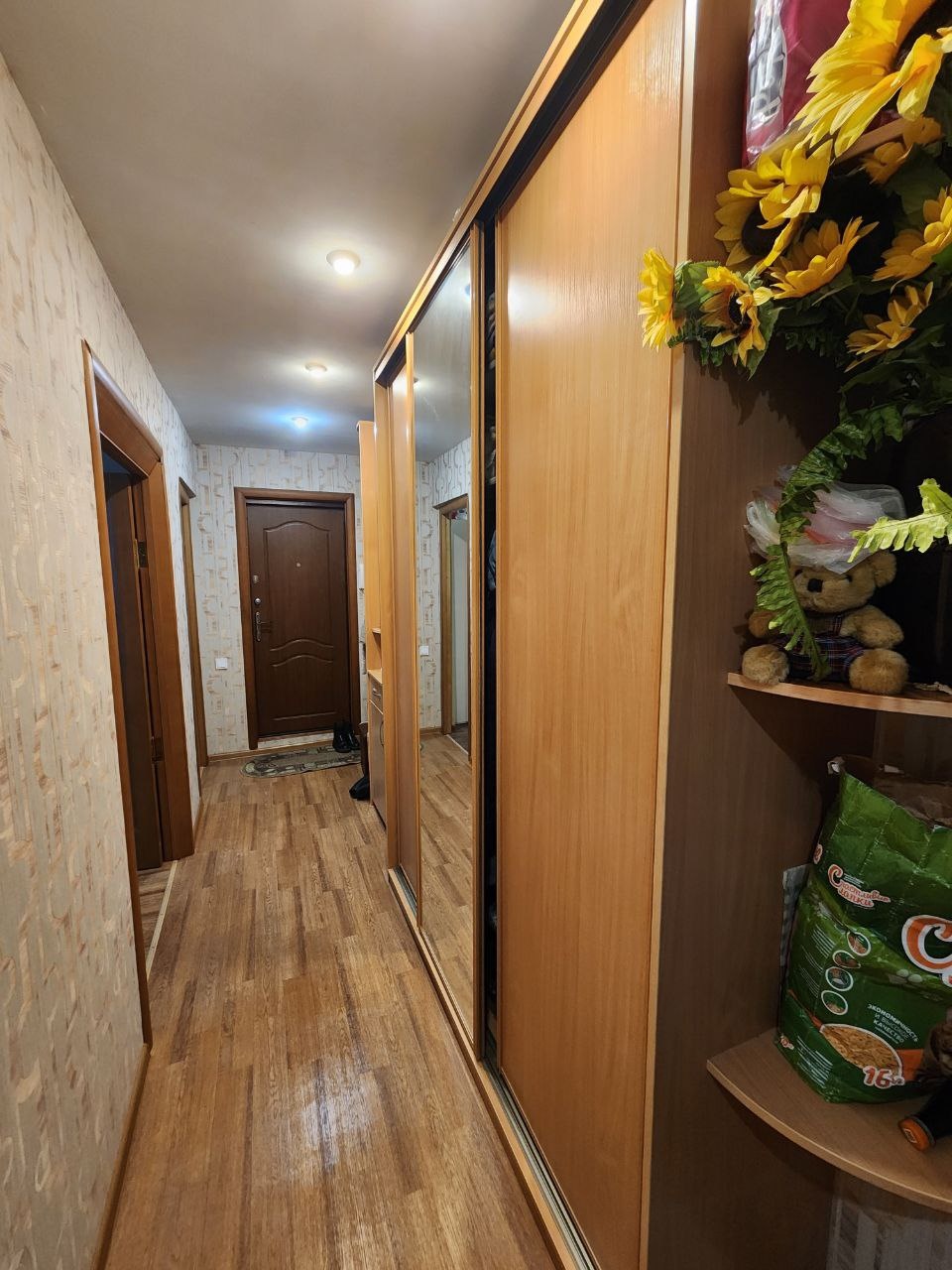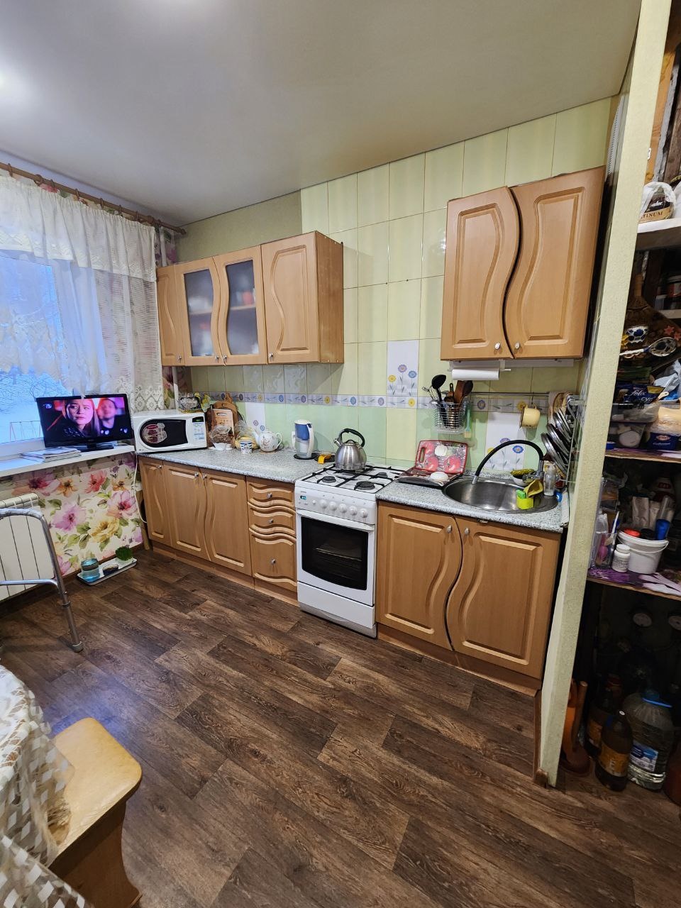 При продаже остается кухонный гарнитур, система хранения в коридоре, мебель в детской и водонагреватель на 100 литров.