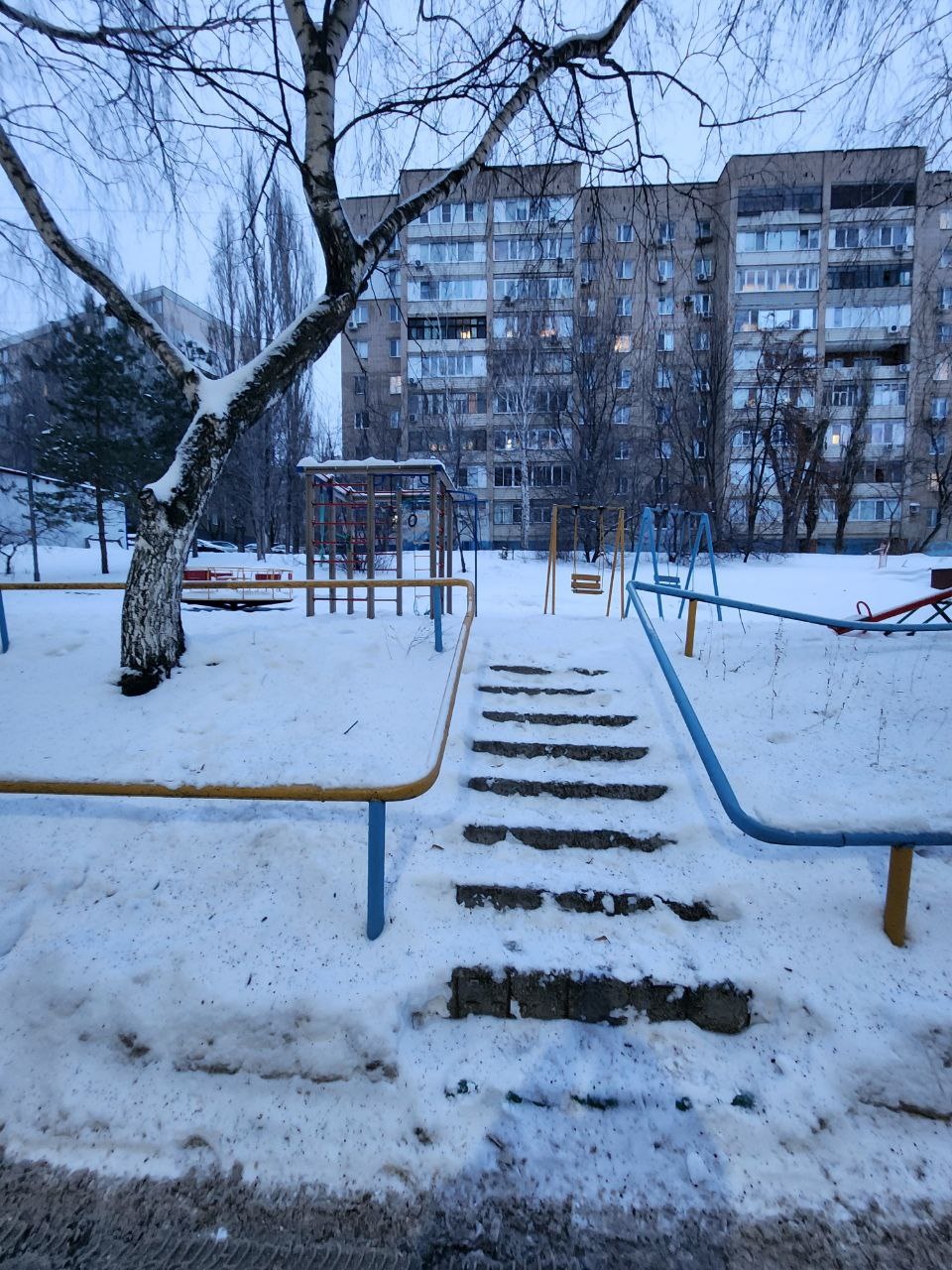 Красивый ухоженный зеленый двор с благоустроенной детской площадкой.