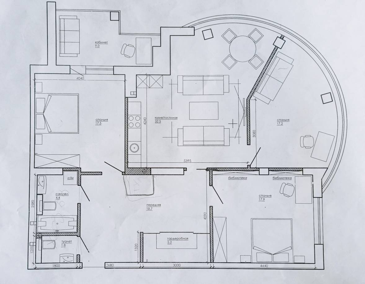 Есть возможность сделать трехкомнатную просторную квартиру, предлагаем план возможной планировки.